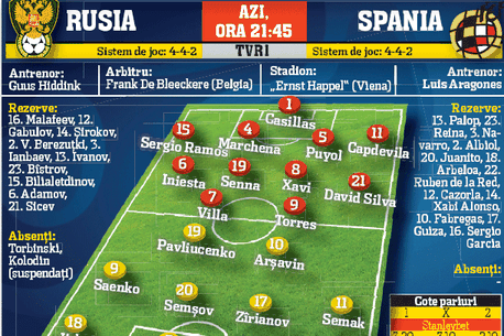 Spania își pune speranțele de a accede în finala Euro 2008 în forța tandemului ofensiv Villa – Torres, atacanți care au reușit împreună să marcheze de cinci ori la acest turneu final. Primul este chiar tunarul de moment, cu patru goluri, trei provenind din partida inaugurală a grupei D, care a însemnat un categoric 4-1 administrat rușilor, pe care acum Spania îi reîntâlnește în semifinală. Villa provine dintr-o familie modestă din Asturia, tatăl său fiind miner. Acesta l-a luat de mână pe micul David și l-a dus la fotbal. Respins de echipa de suflet a tatălui, Oviedo, David a ajuns la Gijon și de aici la Valencia, iar acum valorează 50 de milioane de euro.