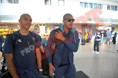 Larsen (în dreapta), la a doua sosire în București. Cea pentru meciul cu Steaua, din returul turului 2 preliminar din Champions League