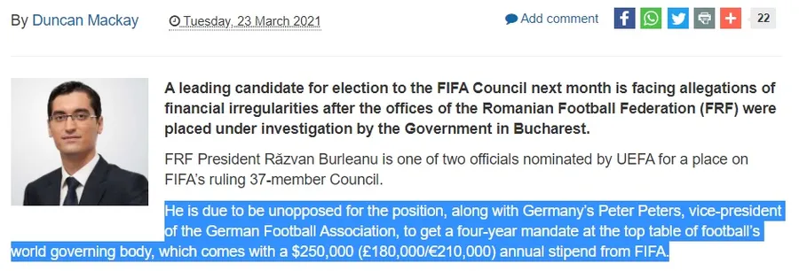 Câți bani va câștiga Burleanu la FIFA? Conform jurnalistului Duncan McKay de la site-ul insidethegames.biz, oficialul român va primi 250.000 de dolari americani pe an, asta însemnând că într-un mandat normal de 4 ani ar atinge un milion de dolari americani. Articolul vorbește despre anumite ilegalități apărute la instituția din București.