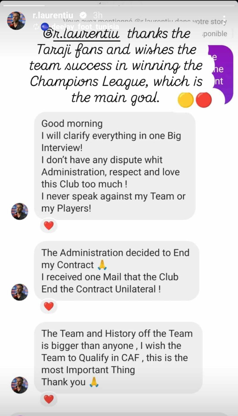 Bună dimineața. O să spun tot prin intermediul unui amplu interviu. Nu am avut nicio dispută cu cei din conducere, respect și iubesc acest club mult prea mult. Niciodată nu o să vorbesc împotriva echipei mele sau împotriva jucătorilor mei. Conducerea a decis să îmi rupă contractul. Am primit un e-mail din partea clubului prin care am fost informat că mi-a fost desfăcut unilateral contractul! Echipa și istoria ei sunt mai presus de orice, așa că îi doresc să se califice în Liga Campionilor Africii, ceea ce reprezintă cel mai important lucru. Mulțumesc”, a completat Laurențiu Reghecampf.