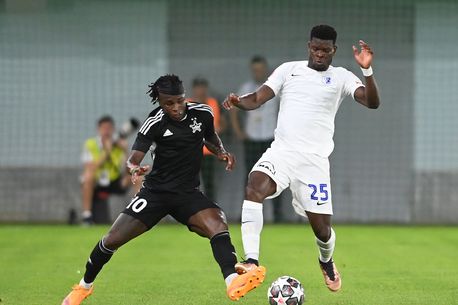 Adrian Mazilu si Moussa Kyabou in meciul de fotbal dintre FC Sferiff Tiraspol si FCV Farul Constanta, din cadrul Preliminariilor Ligii Campionilor, desfasurat pe Stadionul Sheriff din Tiraspol, marti 18 iulie 2023. © FOTO:Razvan Pasarica/SPORT PICTURES