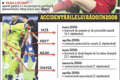 Mirel Rădoi s-a accidentat la coapsă și va rata meciurile cu Bayern și Fiorentina din Liga Campionilor. Căpitanul Stelei nu a apucat să-și conducă echipa decât în două meciuri în Ligă, doar în unul ca titular. Rădoi ar putea rata al treilea sezon la rând să evolueze în grupele Ligii după accidentarea din Feroe. Chiar dacă este liderul și jucătorul reprezentativ a actualei generații de la Steaua, Rădoi nu a apucat să-și conducă echipa în cea mai importantă competiție intercluburi.