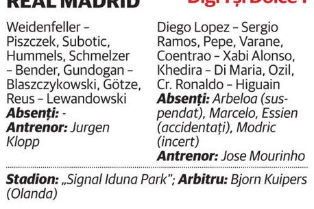 Real nu se teme de Borussia Dortmund. Cel puțin asta este impresia lăsată de Mourinho după ce tehnicianul portughez nu a avut nicio problemă în a face public primul „unsprezece” cu 24 de ore înaintea partidei. E drept, „aroganța” lui Mourinho a venit înainte de demonstrația de forță a celorlalți germani în fața Barcelonei.