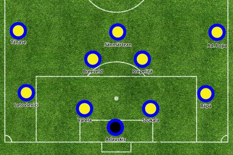Echipa de start a Stelei în meciul cu Ludogoreț, așezată într-un mod 1-4-2-3-1