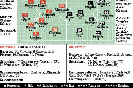 Bordeaux se întoarce în lupta pentru calificare după victoria de aseară. Pe traseul Constanța-Ghencea, francezii ne arătaseră deja un sâmbure din spiritul lor. Iar o echipă rănită ca Bordeaux nu mai avea nevoie să fie condusă pentru a intra în viteză. Barca ardelenilor de la CFR s-a menținut cu greu pe linia de plutire în fața torpilelor trimise de noul copil-minune al Hexagonului, Gourcuff, și a presiunii sufocante la care ne-au supus francezii cam din secunda 49. Am avut însă șansă și un Stăncioiu foarte inspirat. Cât despre atacul nostru, în prima repriză am suspinat la o singură ocazie, capul lui Mureșan, în timp ce Dubarbier și Culio, oamenii noștri de contraatac, au dansat după cum au cântat francezii. Obligați să coboare în apărare pentru a pune umărul lângă Tony și Pereira, rămași de multe ori descoperiți pe benzi, cei doi s-au pierdut în mulțime.