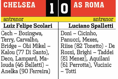 Au bătut la scor pe Middlesbrough în campionat, marcând de cinci ori, însă s-au chinuit să găsească o dată drumul spre plasa porții unei formații măcelărite duminica trecută pe „Olimpico” de Inter cu 4-0. A fost nevoie de o lovitură de cap a căpitanului John Terry pentru ca situația în Ligă să nu devină una cu probleme pentru Chelsea. Roma a existat doar în propria jumătate și în plus l-a pierdut pe Aquilani, cu probleme musculare, unul dintre puținii care mai trăgeau echipa după ei. Italienii rămân în spatele CFR-ului în clasament, iar Chelsea este cu un picior în optimile de finală.