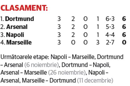 Dortmund, Arsenal și Napoli se bat pentru primele două locuri ale grupei F a Ligii Campionilor, considerată cea mai echilibrată din această ediție