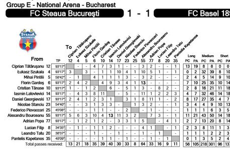Căpitanul roș-albaștrilor a fost din nou la înălțime și a fost jucătorul pe la care au trecut cele mai multe baloane, depășindu-i cu mult și pe elvețieni la capitolul „pase trimise”. Bourceanu a pasat de 89 de ori în meciul de aseară ( lider la Basel a fost Kay Voser, cu 68 de pase) și și-a atins ținta de 68 de ori (un procentaj de 76%).