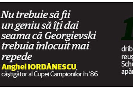 La pauză, Reghecampf a reacționat, trecându-l pe Stanciu în partea dreaptă, însă ajutorul pentru Georgievski a fost în continuare limitat. Mai era o soluție, înlocuirea macedoneanului, însă asta s-a întâmplat abia în minutul 70 când scorul era deja 3-0, iar în locul său a intrat Varela, un apărător central. Ce soluții mai avea Reghecampf? Dintr-un motiv inexplicabil, Georgievski este singurul fundaș dreapta din lotul Stelei trecut pe lista UEFA. Deși Cornel Râpă – cel care l-a marcat în primăvară pe Hazard – nu era accidentat, el nu a fost inclus pe listă, astfel că Prepeliță era singurul fotbalist care mai putea fi folosit fundaș dreapta, însă mijlocașul nu are viteză.
