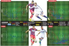 Faptul că Mourinho a premeditat atacurile în partea dreaptă a apărării Stelei e demonstrat de cifre. Adversarul direct al lui Georgievski, Andre Schurrle, a fost fotbalistul lui Chelsea care a primit cele mai multe pase de la colegii săi (69). Astfel a putut să își pună în valoare principala calitate, driblingul în regim de viteză, iar mijlocașul de bandă german a reușit zece treceri pe lângă apărătorii Stelei și a creat trei ocazii importante de a marca, dintre care două au fost goluri. Un ajutor important a venit și din partea lui Ashley Cole. Experimentatul fundaș stânga a profitat din plin de spațiile lăsate de migrarea lui Popa și, apoi, a lui Stanciu spre centru și a urcat în atac de câte ori a avut ocazia. Cole a avut 12 acțiuni ofensive reușite în „treimea” adversă, cu două mai mult decât toți cei 5 fundași steliști, folosiți în meci, la un loc.