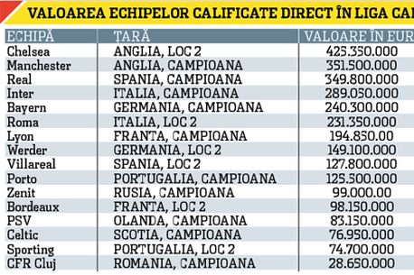 Ocupanta locului 15 în acest top, Sporting, are o valoare a lotului cu aproape 50 de milioane de euro mai mare decât cea a formației lui Ioan Andone! Comparativ, valoarea totală a „feroviarilor clujeni“ este mai mică decât a lui Cristiano Ronaldo (55.000.000 de euro), Zlatan Ibrahimovic 38.000.000 de euro) sau Robinho (35.000.000 de euro)!