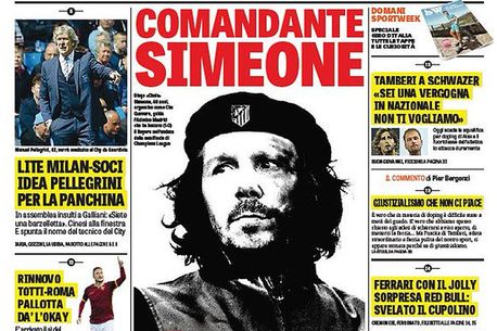 Cotidianul italian Gazzetta dello Sport îi dedică prima pagină a ediției de astăzi argentinianului Diego „Cholo” Simeone, după ce fostul mijlocaș care a jucat în Serie A pentru Pisa, Inter sau Lazio a apropiat-o pe Atletico Madrid de o nouă finală Champions League.