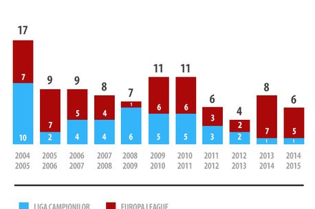 În ultimele sezoane, performanțele fotbalului românesc pe plan european au fost din ce în ce mai slabe, iar acest lucru se poate observa și din numărul jucătorilor români care au evoluat pentru echipele din străinătate în Liga Campionilor sau Europa League. Daca în sezonul 2005-2006 România se putea lăuda cu 17 jucători și doi antrenori în competițiile europene, în acest sezon, cu excepția celor două echipe de club românești din Europa League, Steaua și Astra Giurgiu, doar șase fotbaliști români vor evolua în grupele Ligii Campionilor sau Europa League.