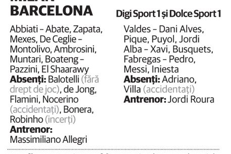Silvio Berlusconi pare să fi descoperit leacul pentru jocul nimicitor al Barcelonei. Magnatul italian i-a trimis sarcină antrenorului Allegri să pună marcaj la om pentru starul Lionel Messi, iar tehnicianul s-a conformat. Argentinianul nu a avut unul, ci doi paznici. Veteranul Ambrosini s-a ținut scai de omul de gol al catalanilor, iar când vârsta nu îi mai permitea să țină pasul, Muntari îl suplinea la perfecție. Rezultatul: Barcelona a avut două ocazii tot meciul, câte una pe repriză!
