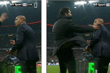 Atletico Madrid s-a transformat în mandatul lui „Cholo” Simeone într-o echipă după chipul și asemănarea fostului închizător, care transpiră din prima până în ultima secundă a meciului pentru un rezultat pozitiv. Iar Simeone trăiește meciul pe margine la puls 200 și în multe rânduri pare la un pas să-și piardă mințile. Așa s-a întâmplat și în meciul cu Bayern, când în secundele de final argentinianul a explodat pur și simplu când arbitrul a întârziat momentul unei schimbări. Și-a vărsat nervii pe colaboratorul său (foto jos), care ar fi trebuit să meargă cu tabela la marginea terenului pentur a anunța schimbarea, și l-a lovit pe acesta, momentul fiind surprins în transmisiunea partidei.