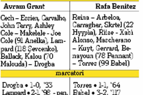 „Este un fotbalist bun, dar cade foarte mult. E un actor, așa că arbitrii trebuie să fie foarte atenți la el”, declara Benitez înaintea partidei de miercuri. Drogba nu l-a păcălit pe Roberto Rosetti, însă i-a derutat pe fundașii lui Liverpool. Prestația sa, sportivă, nu actoricească, dusă la perfecțiune de cele două goluri, merită un Oscar. Iar finala cu United, de pe “Lujniki”, poate fi scena pe care poate primi acest trofeu, echivalat cu trofeul Ligii Campionilor.