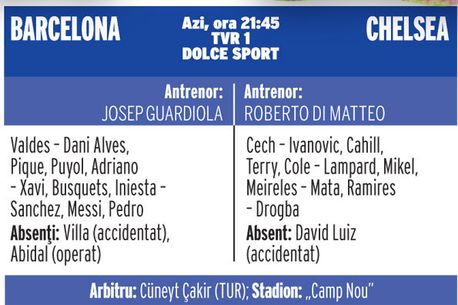 „Extraterestrii” riscă să bifeze un sezon șters. Unul neîntâlnit în era Guardiola. După ce Realul i-a oprit seria de trei titluri consecutive, Chelsea poate pune capăt speranțelor Barcei de a deveni prima echipă după Milanul de la sfârșitul anilor ’80 care să câștige două trofee consecutive în Liga (Cupa) Campionilor. „Ce se întâmplă în returul cu Chelsea va marca restul sezonului Barcelonei”, a recunoscut și Guardiola. Presa engleză visează ca Chelsea să repete performanța Realului, care a demonstrat că Barca nu e imbatabilă pe propriul teren. „Trebuie să-i tăiem alimentarea lui Messi”, au scris englezii, aluzie la blocarea creierelor Xavi și Iniesta, executată excelent de Real. Jucătorii „albaștri” speră la o repetare a prestației de pe „Stamford Bridge”. „Nu vom schimba nimic, ne vom apăra până în ultimul minut!”, a promis fundașul Gary Cahill, cel care l-a blocat pe Messi în turul de pe „Stamford Bridge”.