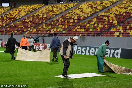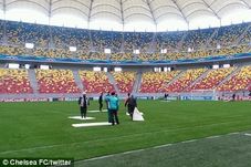 Pentru ca antrenamentul oficial al celor de la Chelsea să se desfășoare în condiții cât mai bune, reprezentanții Primăriei au trimis câțiva angajați care s-au străduit să strângă apa cu ajutorul unor bureți. Englezii s-au arătat destul amuzați de metoda aleasă de români pentru rezolvarea problemei.