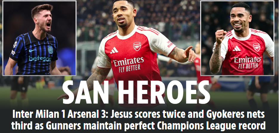 „Gabriel Jesus a marcat de două ori în victoria lui Arsenal în fața lui Inter Milano, menținându-și recordul de 100% în Liga Campionilor.