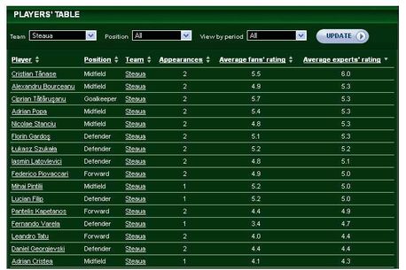 În clasamentul alcătuit de UEFA după primele etape, Cristian Tănase și Alexandru Bourceanu sunt fotbaliștii care au reușit să țină steagul sus. Aceștia ocupă pozițiile fruntașe dintre fotbaliștii Stelei, într-un top format în urma voturilor primite de fani și a notelor oferite de experții UEFA.