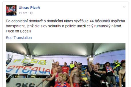Distribuită masiv în social media de către fanii Stelei, fotografia cu momentul respectiv a fost explicată într-o postare de Facebook a unui grup de suporteri ai Viktoriei. „După o înțelegere cu ultrașii români am afișat un mesaj care, potrivit celor de la securitate, a ofensat întreaga națiune română”, au spus cehii postând fotografia în care apare bannerul cu pricina. Mesajul lor a fost încheiat cu o înjurătură în limba engleză la adresa lui Becali.
