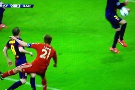 Minutul 15 al partidei dintre Bayern și FC Barcelona, din prima manșă a semifinalelor Ligii Campionilor, a rezervat și prima fază litigioasă a dublei dintre cele două echipe. După un șut al lui Lahm din afara careului, Pique s-a interpus pe traiectoria balonului și a pus mâna în calea acestuia, reușind să-l devieze în aut de poartă.