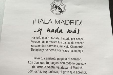 Suporterii lui Real Madrid care au mers pe Santiago Bernabeu pentru returul cu Juventus au găsit pe scaune bucăți de hârtie cu versuri pe care ar fi trebuit să le fredoneze în timpul meciului.