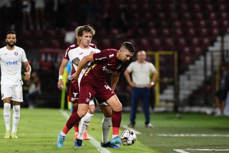 Ciprian Deac (S), de la CFR Cluj, suteaza in timpul meciului de fotbal contra echipei Pyunik Everan din returul primului tur preliminar al Ligii Campionilor, disputat pe stadionul Dr. Constantin Radulescu din Cluj-Napoca, miercuri, 13 iulie 2022. FLAVIU BUBOI / MEDIAFAX FOTO
