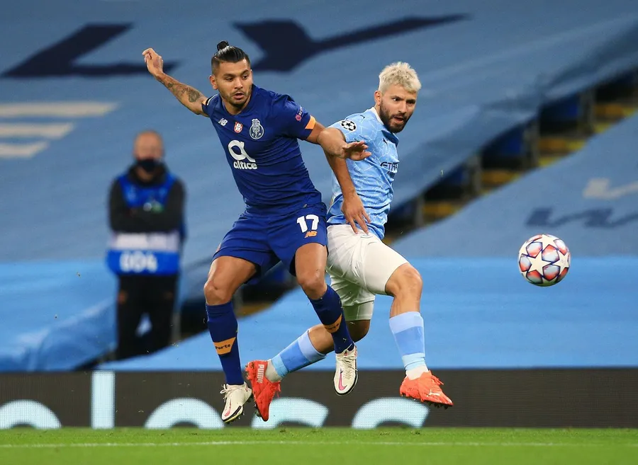 Sergio Aguero de la Manchester City în duel cu Jesus Manuel Corona de la Porto din prima etapă a fazei grupelor Ligii Campionilor 2020-2021 | sursă foto: profimedia.com