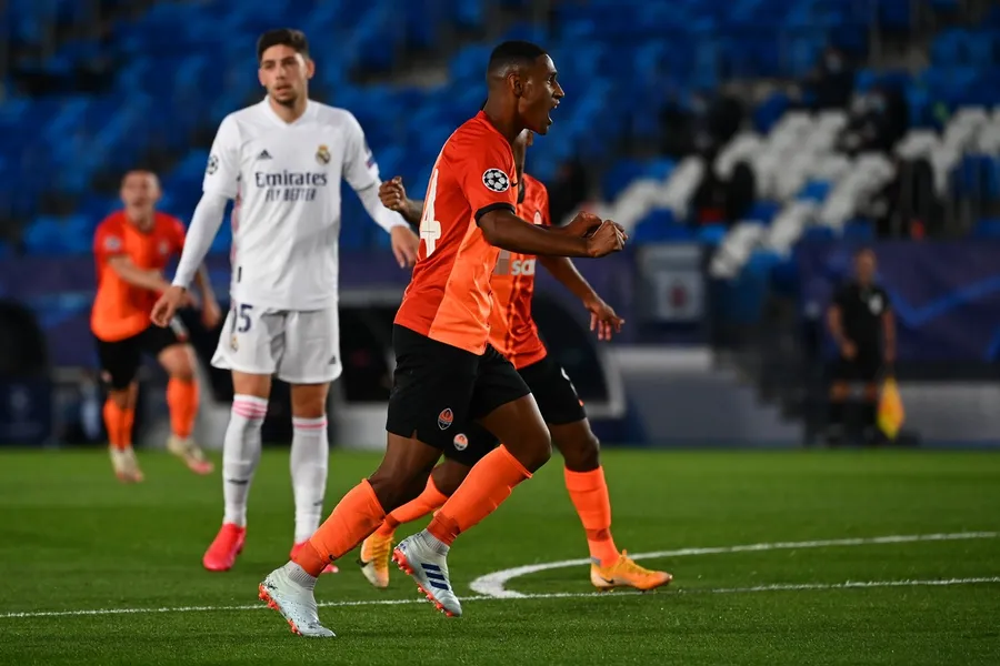 Atacantul brazilian Tete de la Șahtior Donețk celebrează deschiderea scorului, în meciul cu Real Madrid, din prima etapă a fazei grupelor din Liga Campionilor 2020-2021 | sursă foto: profimedia.com