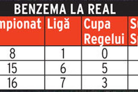 A ratat o ocazie imensă pe „GSP Arena”, la 0-0, dar și-a dovedit până la urmă stofa de golgheter și în Cipru. Karim Benzema, „pisica” de care se plângea Mourinho în vara lui 2010, a ajuns să zgârie rău. Cel mai grav în Liga Campionilor, unde l-a depășit și pe coechipierul Ronaldo, după „dubla” din meciul cu APOEL. Cu cele două reușite de marți seară (74, 90), „SuperBenz” a ajuns la 7 goluri în actualul sezon al Ligii Campionilor, unul peste CR 7. Benzema are acum 26 de goluri în cea mai prestigioasă competiție intercluburi, în doar 41 de partide. A fost mai rapid chiar decât Messi, care a avut nevoie de 42 de meciuri pentru a bifa acest număr. Filippo Inzaghi și Ruud van Nistelrooy sunt singurii care s-au mișcat mai repede. Au atins 25 de goluri în Ligă în doar 30 de partide! Transferat de la Lyon în vara lui 2009, în schimbul a 35 de milioane de euro, Benzema (24 de ani) pare acum în vârf de formă la Real. Deja a ajuns la 27 de goluri, în toate competițiile, cu unul mai mult decât a marcat în întreg sezonul trecut!