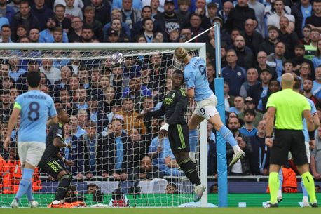 Min. 21: Courtois l-a blocat din nou pe Haaland, cu o nouă intervenția fabuloasă, tot în urma unei lovituri de cap a atacantului lui City!
