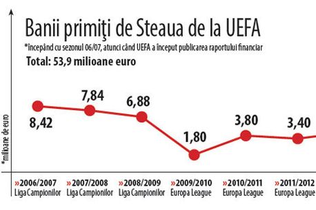 Suma ar fi putut crește în funcție de performanțele din grupă, acolo unde forul fotbalistic european recompensează cu 500.000 de euro un rezultat de egalitate și cu 1 milion de euro o victorie. Luând în calcul rezultate similare celor de anul trecut, atunci când Steaua a făcut trei egaluri, suma încasată ar fi fost de 1,5 milioane de euro.