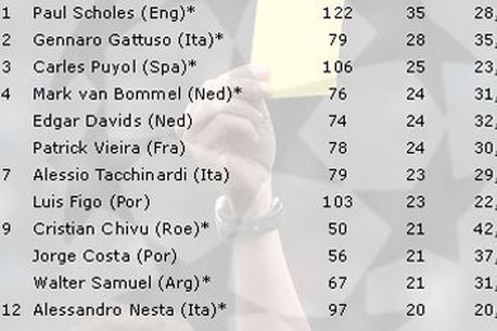 În clasamentul cartonașelor galbene adunate de-a lungul meciurilor disputate în Liga Campionilor, Cristi Chivu abia prinde un loc în Top 10, clasându-se pe locul 9 cu 21 de avertismente, Într-un clasament dominat de Paul Scholes, Gennaro Gattuso și Carles Puyol.