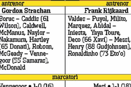 Deși gazdele au început în forță, Vennegoor of Hesselink, vârful olandez al celor de la Celtic, deschizând scorul după o furișare prinÂtre centralii Barcei, Messi a readus egalitatea în doar două minuÂte. La pauză, contrar cifrelor statistice ale primei părți, posesie, șuturi la poartă, ocazii de gol, tot gazÂdele au intrat în avantaj la cabine.