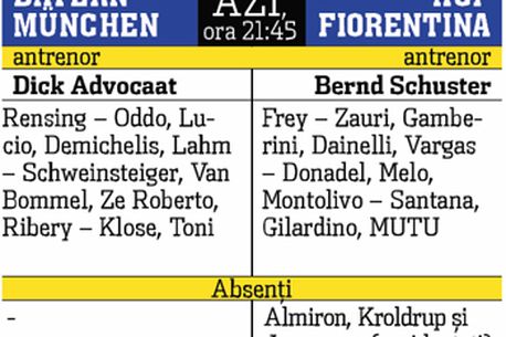 Și în cealaltă tabără există semne de întrebare privind utilizarea lui Luca Toni. Fostul coechipier al lui Mutu s-a accidentat la spate în partida de campionat cu Karlsruhe, câștigată de Bayern cu 1-0, și a devenit incert pentru partida din această seară. Totuși, se pare că Jurgen Klinsmann îl va forța pe italian, mai ales că vrea să îl bată pe prietenul său din atacul Fiorentinei.