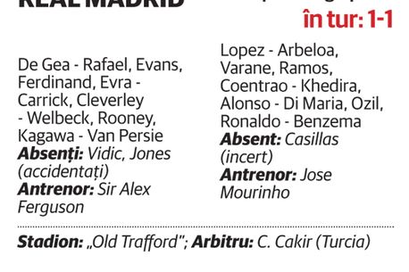 Asta chiar dacă, surprinzător, Ferguson nu l-a titularizat pe Wayne Rooney, preferând un cuplu inedit în spatele lui van Persie, format din Nani și Welbeck . O greșeală? Nicidecum! Experimentatul manager al lui Manchester United a gândit perfect jocul. A cedat posesia Realului (63% în prima repriză), iar madrilenii nu au știut ce să facă cu balonul. Practic, Mourinho a fost obligat să găsească antidotul unui joc pe care l-a folosit cu atâta succes în ultima săptămână în fața Barcei. Nici măcar Ronaldo, omul care marcase de fiecare dată împotriva fostei echipe în Ligă și care câștigase toate meciurile disputate pe „Old Trafford” în cea mai importantă competiție european, nu a mișcat. Supravegheat în permanență de Giggs și Rafael, CR7 a fost doar un pasager pe teren, nereușind să își găsească locul.