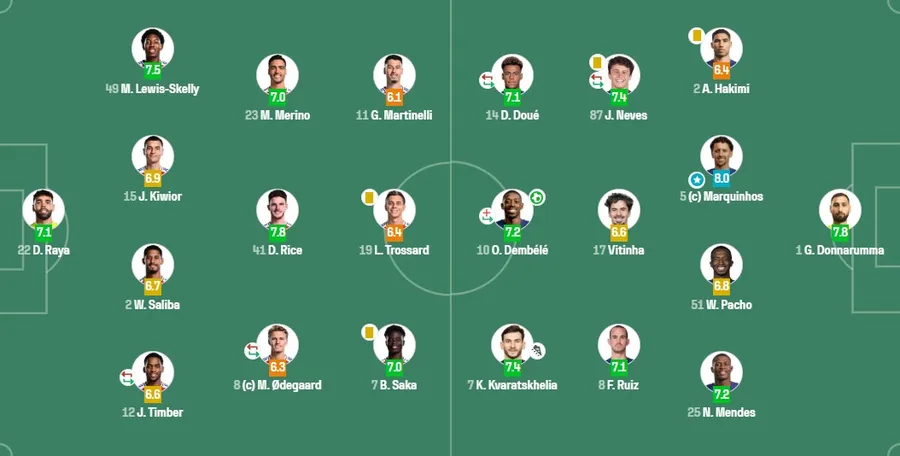 Conform platformei de specialitate Sofascore.com, cel mai bun jucător de pe teren a fost brazilianul Marquinhos, fundașul celor de la PSG, care a fost notat cu 8.0. Declan Rice și Donnaruma, ambii cu nota 7.8, se află pe poziția a doua. La polul opus se află un jucător din lotul pregătit de Mikel Arteta, Gabriel Martinelli, care a fost notat cu 6.1 pentru prestația pe care a avut-o în manșa tur a semifinalei din UEFA Champions League.