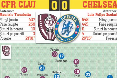Cunoscând forța englezilor la mijloc, italianul de pe banca CFR-ului a încercat să blocheze orice spațiu în zona din fața propriului careu. Dovada că i-a reușit sunt cele 46 de acțiuni utile din 170 de baloane jucate inițiate de cuplul Lampard – Obi Mikel. Chelsea nu a oferit multe.