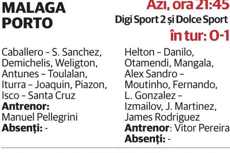 În timp ce Arsenal șoca pe „Allianz Arena” cu Bayern, Malaga încerca să remonteze handicapul din turul cu Porto. Dacă pe „Dragao”, formația spaniolă nu a reușit să tragă decât două șuturi la poartă, echipa lui Manuel Pellegrini a fost mult mai periculoasă aseară.