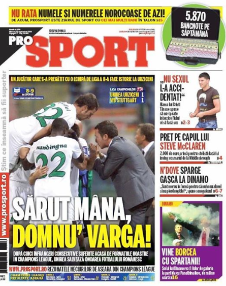 Așa arăta prima pagină a ziarului ProSport, în urmă cu fix 10 ani, după Unirea Urziceni – VfB Stuttgart 1-1