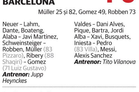 Deși multe voci din fotbalul european o vedeau pe Bayern favorită și considerau că nu a existat un moment mai bun pentru ca o echipă să o învingă pe Barça, nimeni nu se aștepta la o diferență atât de mare! Însă după cele 90 de minute de pe „Allianz Arena”, scorul pare perfect justificat. Heynckes a pregătit perfect meciul și a profitat la maximum de slăbiciunile catalanilor, care au fost expuse și de Real Madrid în acest an.
