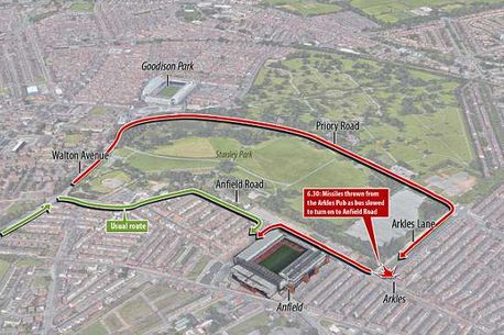 În mod normal, autocarul echipei din Manchester trebuia să vireze spre stadion, pe lângă parcul Stanley, care separă Anfield de Goodison Park, arena celor de la Everton. În schimb, șoferul a fost somat să traverseze întreg parcul, iar rezultatul a fost unul dezastruos. Străzile sunt mult mai înguste pe traseul respectiv, iar vehiculul de mare tonaj a fost nevoit să staționeze pentru câteva momente cu câteva sute de metri înainte de a ajunge la destinație. Înainte de a intra pe Anfield Road, strada pe care este situat stadionul „cormoranilor”, șoferul autocarului a avut de efectuat un ultim viraj. Acesta a avut nevoie de câteva mișcări suplimentare, zona fiind una îngustă. În tot acest timp, suporterii lul Liverpool au aruncat cu diverse obiecte în autocar.