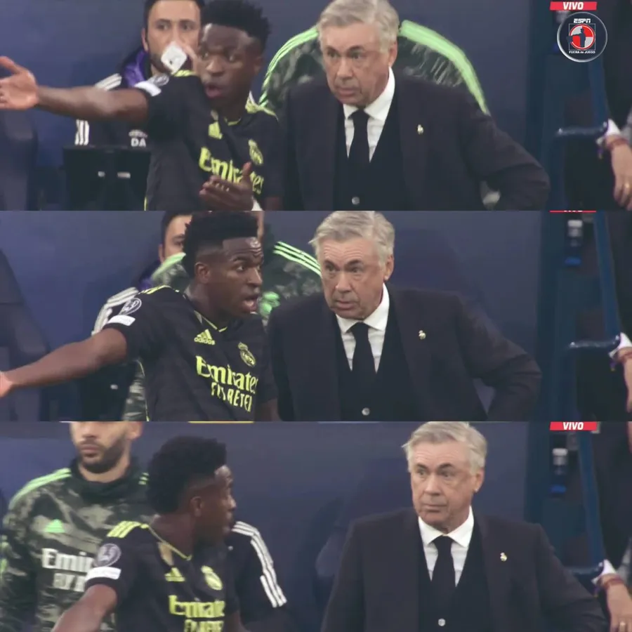 Imediat, camerele TV au surprins un moment uluitor: brazilianul Vinicius s-a dus glonț la banca de rezerve și a început să gesticuleze nervos. Sud-americanul, care a fost inexistent în meci până în acel moment, părea că îi reproșează tactica aleasă lui Ancelotti, spre stupoarea antrenorului italian, care se uita la el uluit.