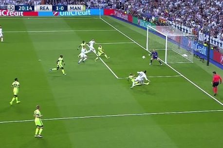 Plecat de la limita off-side-ului, galezul a fost găsit în careu de pasa lui Carvajal și a încercat un șut-centrare, ținta sa fiind Jese, aflat la colțul lung. Fernando a încercat însă să blocheze și intervenția sa a făcut ca mingea să se ducă în poarta lui Hart.