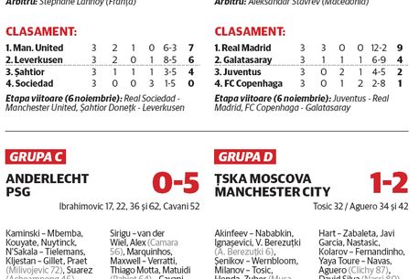 Parizienii au fost, însă, la mare concurență cu nemții; Bayern a făcut o nouă demonstrație de fotbal total (5-0 contra lui Plzen), după ce etapa precedentă se impunea fără drept de apel pe terenul lui City. Și de această dată vioara întâi a fost Frank Ribery – autor al unei duble -, francezul arătând încă o dată că este un concurent serios în lupta pentru „Balonul de Aur”, chiar dacă Ronaldo și Messi sunt adevărate mașinării de marcat goluri. Dar nu doar bavarezii au fost de neoprit, la câteva sute de kilometri distanță „Aspirinele” de la Leverkusen umilind formația lui Mircea Lucescu (4-0). Tehnicianul român a fost încă o dată trădat de portar – Pyatov a mai bifat un meci extrem de slab -, dar poate pune diferența uriașă de pe tabela de marcaj și pe seama arbitrajului, lui Bayer fiindu-i acordat gratuit un penalty.