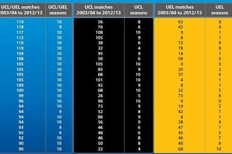 Raportul UEFA mai arată că echipă din Ghencea este o specialistă a Europa League. Dintre cele 110 meciuri disputate în cupele europene, 78 au fost în a doua competiție a Europei. De altfel, din primele 20 de echipe din acest clasament, Steaua are cele mai puține sezoane petrecute în Liga Campionilor, doar 4.