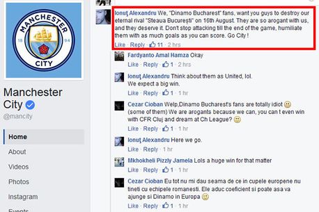 Rivalitatea dintre Steaua și Dinamo a fost mutată de un suporter pe contul de Facebook al lui Manchester City. Fanul dinamovist le cere celor de la City să le dea cât mai multe goluri, în dubla din play-off-ul Ligii Campionilor.