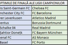 S-au tras la sorți optimile de finală din Liga Campionilor: PSG - Chelsea, City - Barcelona, Șahtior - Bayern. Duel românesc în șaisprezecimile Europa League: Spurs - Fiorentina. Toate meciurile