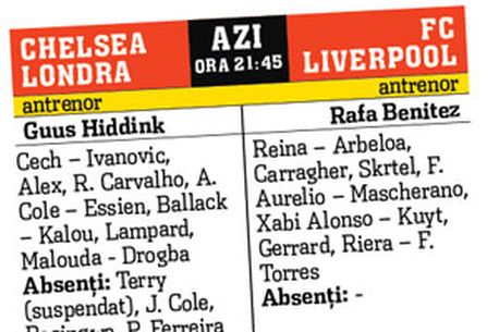 La fel va fi și azi, pe terenul lui Chelsea, echipa lui Rafa Benitez având nevoie de trei goluri pentru a spera la semifinalele Ligii. Până la ora meciului, Gerrard trebuie să primească însă OK-ul staffului medical, din cauza unei lovituri la aductori care l-a împiedicat să joace în ultimul meci de campionat.